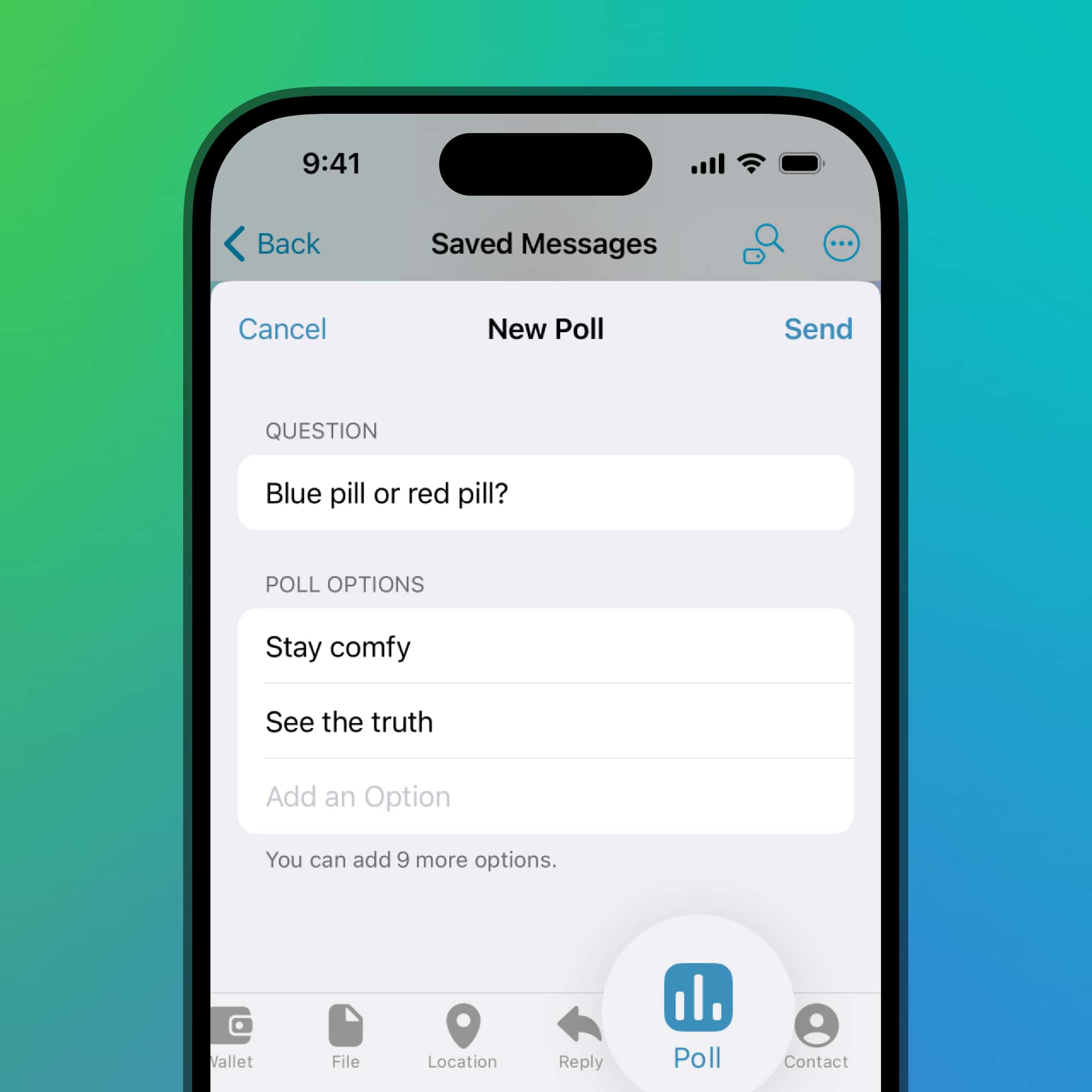 Mit diesem Update werden Umfragen noch flexibler und unterstützen jetzt bis zu 12 Antwortmöglichkeiten. Umfragen können außerdem an deinen Chat Gespeichertes weitergeleitet werden, um die Ergebnisse später wiederzufinden oder die Umfrage mit anderen Chats zu teilen.