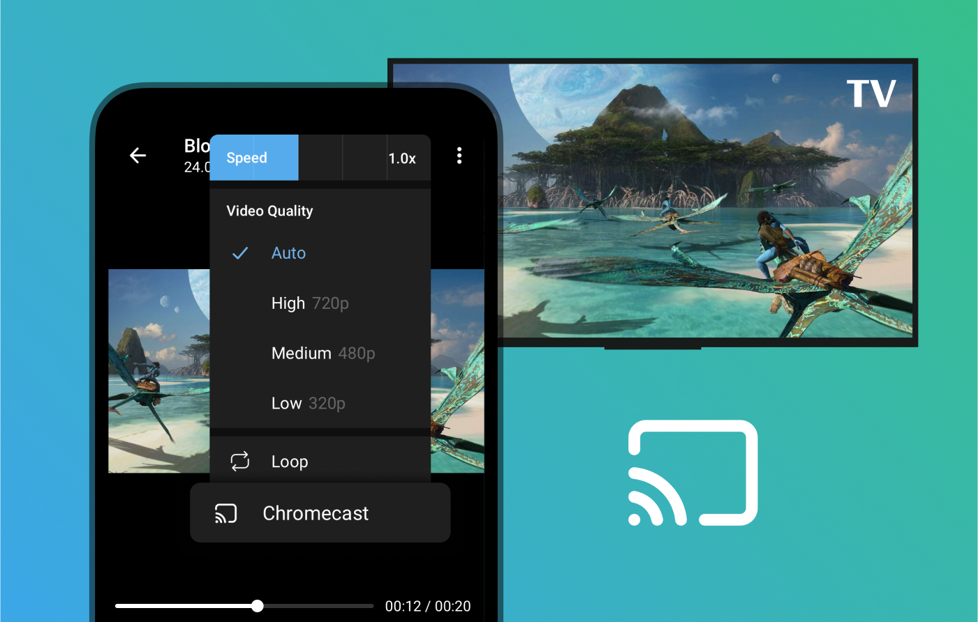 So streamst du: Öffne ein Video, tippe auf das Einstellungen-Symbol und wähle Chromecast aus.